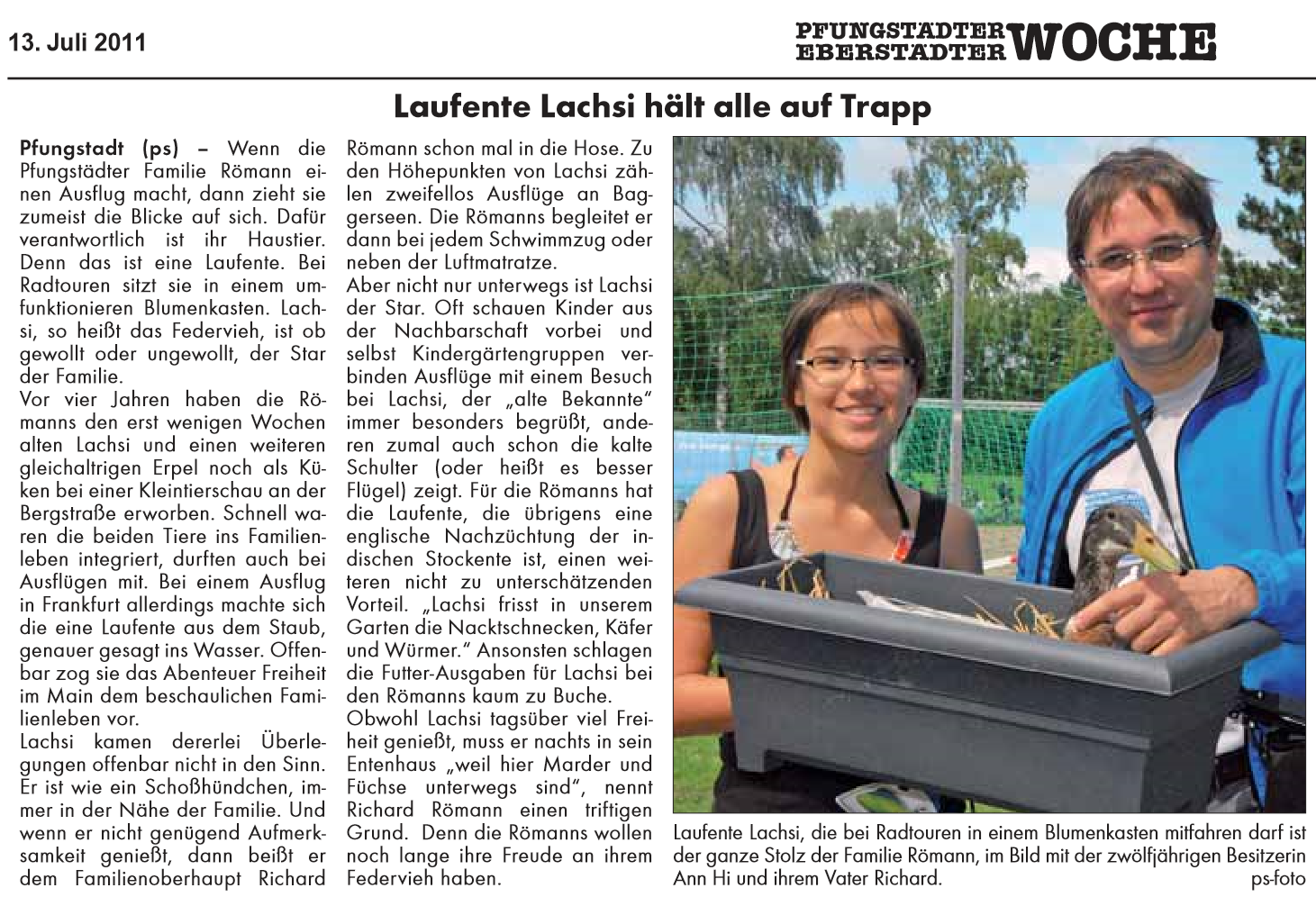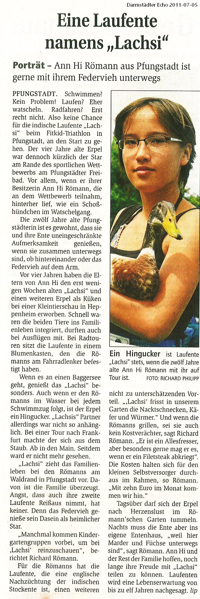 Wir alle trauern um Lachsi, die beliebte Zeitungs-, Fernseh-, Streichel- und Laufente aus Pfungstadt.